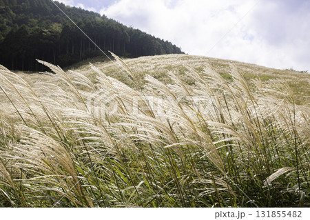 岩手県盛岡市天峰山から見る逆光のすすきの風にそよぐ秋の風景