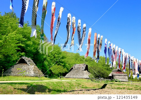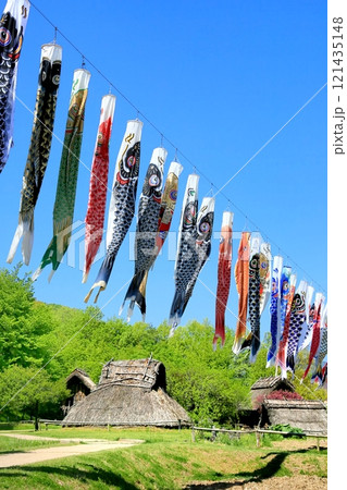 鯉のぼりがはためく、千曲市森将軍塚古墳館 科野の村 復元住居