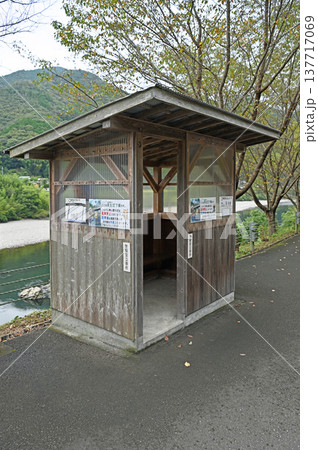 四万十川沿いに佇む岩間沈下橋近くの木造バス待ち合い所