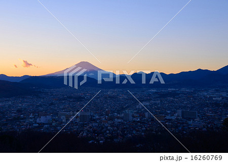 夕暮れ時の富士山と秦野の町並み