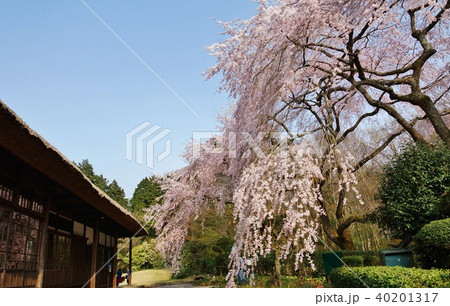 静岡県桜スポット・秩父宮記念公園の別邸母屋脇に満開の枝垂桜・青空バック横位置人影あり