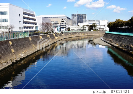 神奈川県藤沢市 境川と秩父宮記念体育館方面の町並み