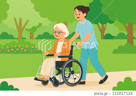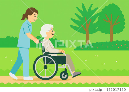 スクラブ姿の女性と車いすに乗った年配の男性イラスト