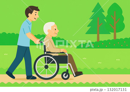 ケーシー姿の男性と車いすに乗った年配の男性イラスト