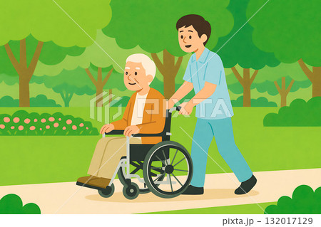ケーシー姿の男性と車いすに乗った年配の女性イラスト