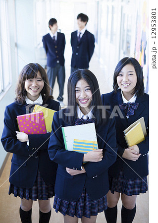 笑顔で校舎を歩く中学生・高校生・女子高生(登校・下校・通学)