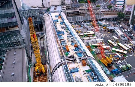 日本の東京都市景観 渋谷駅の上部鉄骨端に向きを変えた大型クレーン(画面右)などを望む