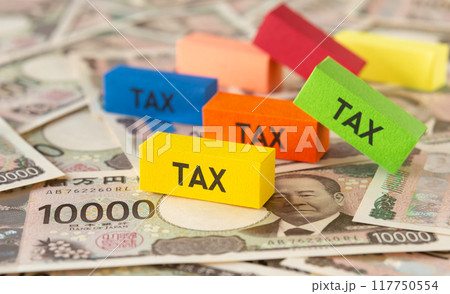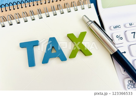 車にかかる税金、自動車税、消費税|「TAX」と書かれた積み木と車のおもちゃとコピースペース