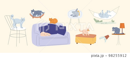 Fluffy cats, various poses cat. Different kittens sleep on sofa, resting in a hammock and chair. Pet cleaning, sitting on table or animals bed, vector set