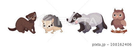 Forest Animals with Weasel, Hedgehog, Badger and Owl Vector Set