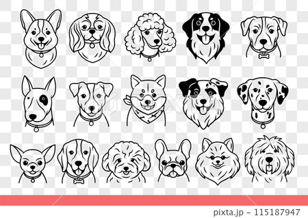 Faces of dogs of different breeds look at screen with positive emotions. Hand drawn doodle