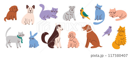 Vector illustration set of cute pets, collection of cats, dogs, parrots. Domestic animals, rabbit icon. Adorable husky, bulldog, schnauzer, doberman, siberian cat. Flat cartoon style for pet care