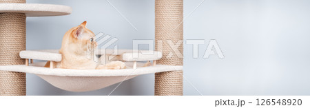 Burmese cat resting on a cat tree.