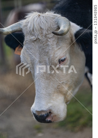 Cow head showing horns and white fur