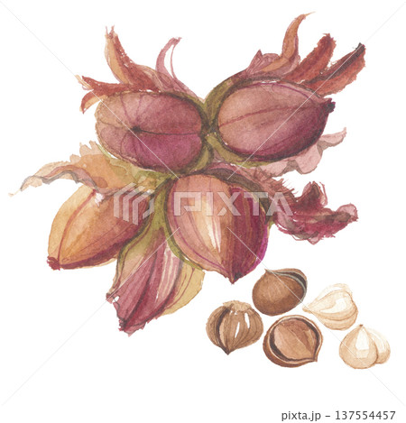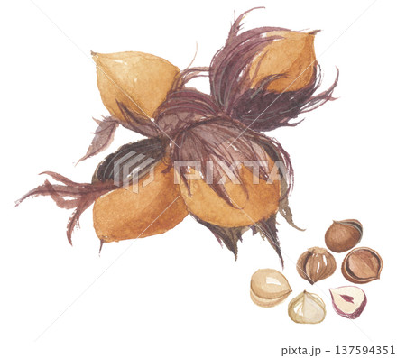 水彩で描いたセイヨウハシバミの実 ヘーゼルナッツ