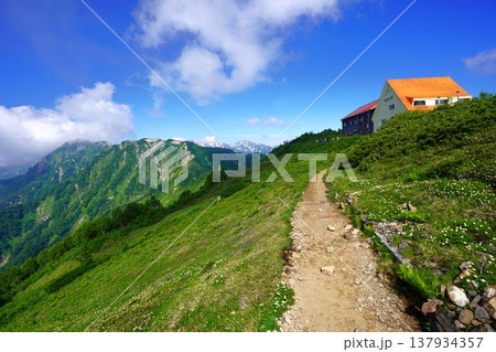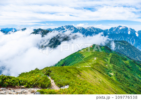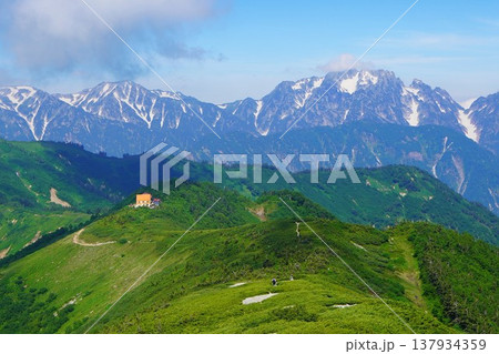 北アルプス・冷池付近から見る種池山荘と穂高岳・槍ヶ岳