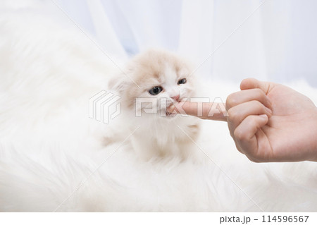 女性の指を舐めるスコティッシュフォールドの仔猫