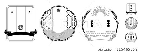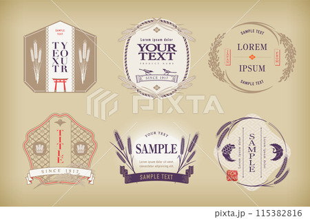 A set of retro Japanese-style labels with rice, wheat and rice motifs. Transparent background.