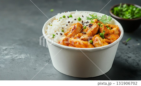 Rice bowl with chicken teriyaki with sesame and leek slice isolated white background