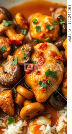 Delicious cooked chicken with mushrooms served over fluffy white rice in a savory sauce