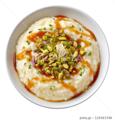 Creamy Rice Pudding Infused with Cardamom and Topped with Caramelized Pistachios and Drizzle of Honey