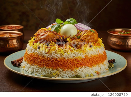 A close-up of delicious Chicken Biryani in a bowl, featuring spiced chicken pieces, basmati rice, saffron color, onions, and cilantro.