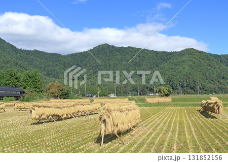 岩手 奥州市 収穫時期の田園風景と稲わら干し(ほんにょ)