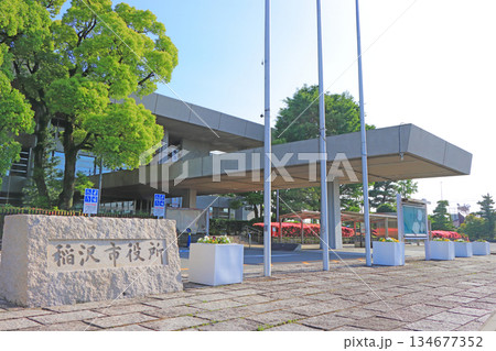 愛知県稲沢市、新緑に囲まれた稲沢市役所の風景