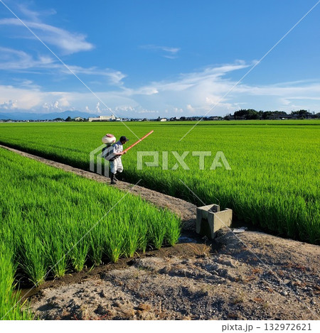 青空の下、水田に肥料を散布する男性(穂肥作業)