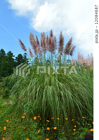 オレンジ色のコスモス・シロガネヨシ(パンパスグラス)(埼玉県比企郡ときがわ町)