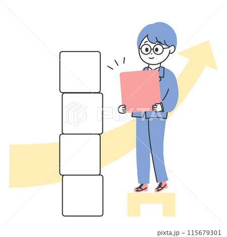 評価 技術 経験 知識 自信の積み木を積み上げるポニーテールのイラスト