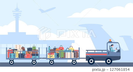 Carrying luggage with truck. Airport employee brings bags and suitcases for loading or collection. Driver service worker, tourism and travel recent vector scene