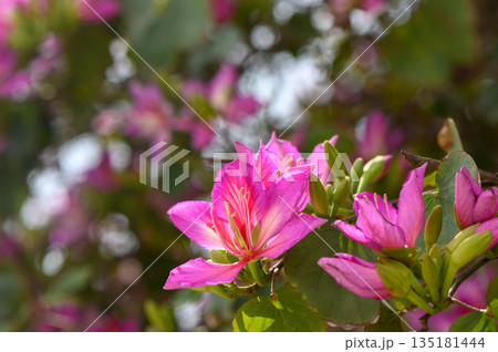Vibrant pink blossoms emerge among lush green leaves in a serene garden during a sunny spring afternoon