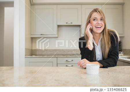Woman leaning on marble countertop in kitchen holding smartphone and white coffee cup, copy space
