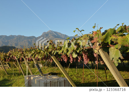 北杜市白州町、南アルプス甲斐駒ケ岳の麓、収穫間近の醸造用甲州ぶどう