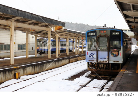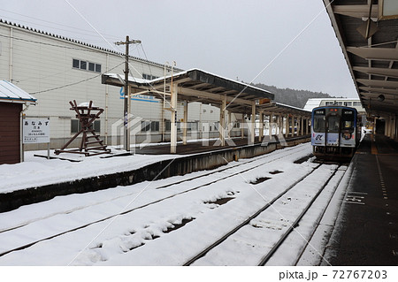 冬の穴水駅に停車する のと鉄道 NT200形気動車
