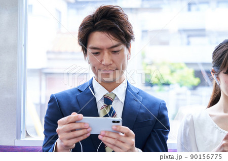 電車内でスマホを見るスーツ姿の男性 撮影協力「京王電鉄株式会社」