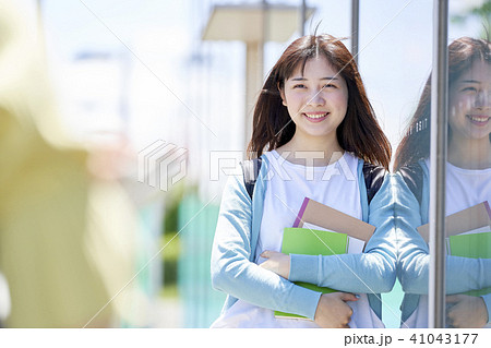 バス停前でバスを待つ学生 高校から登下校する女子高校生 通学 住宅地 市街地