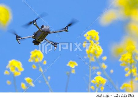 春の花畑を飛ぶドローン右上