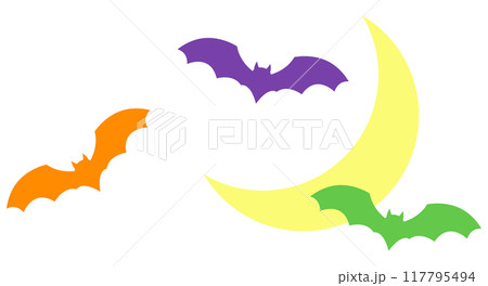 空を飛ぶコウモリ3匹と、三日月