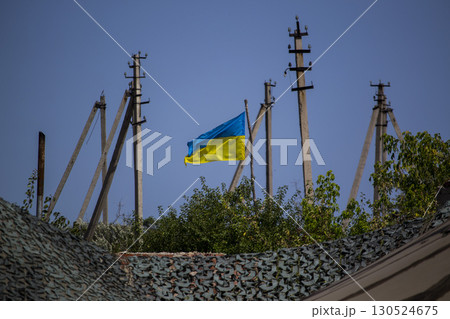 Ukrainian national flag waving in the wind against blue sky and power poles. Symbol of freedom, patriotism, independence and national identity