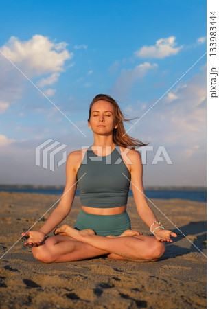 A woman performs Ashtanga Vinyasa yoga in Padmasana with Chin mudra on the beach, meditating peacefully as the sun sets