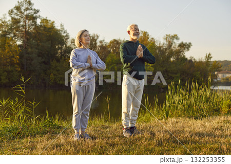 Senior people yoga outdoor, practice, group of old mature spouses working out in sports session