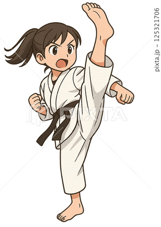Girl Karateka Doing Powerful Kick, Karate Fighter Character in White Kimono Practicing Traditional Japan Martial Art Cartoon Style Vector Illustration