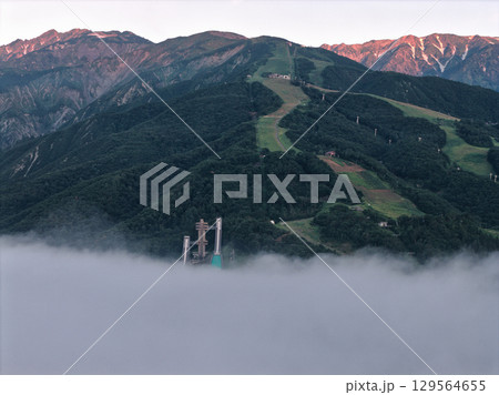 美しい雲海と唐松岳のモルゲンロート 長野県白馬村(ドローンによる空撮)