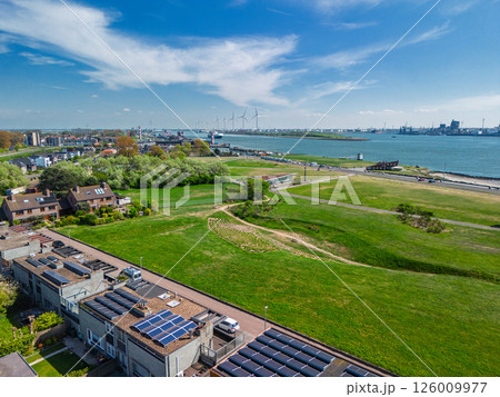 Aerial view of a coastal town with green parks, residential areas, a riverfront road, and busy shipping lanes. Wind turbines and industrial port facilities are visible across the water.