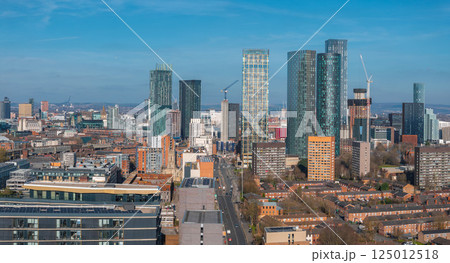 Aerial view of Manchester, UK, showing modern skyscrapers, construction cranes, and a mix of historic and contemporary buildings on a sunny day.