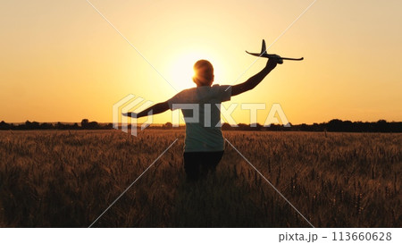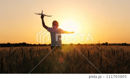 Happy male teenager running with aircraft toy flying pilot imagination at sunset sunrise wheat field back view. Joyful boy kid child silhouette playing plane plaything fantasy flight game meadow dusk