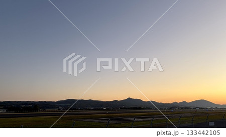 夕暮れに染まる空港と山並み