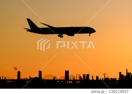 夕暮れに着陸する旅客機